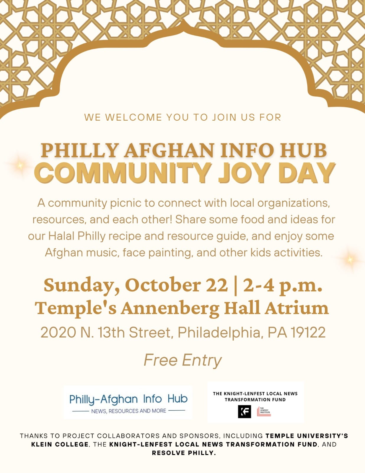 On October 22, 2023, the Philly-Afghan Info Hub hosted a Community Joy Day, bringing together Afghan residents of Philadelphia and local organizations for resource-sharing, music, face-painting, and celebration.